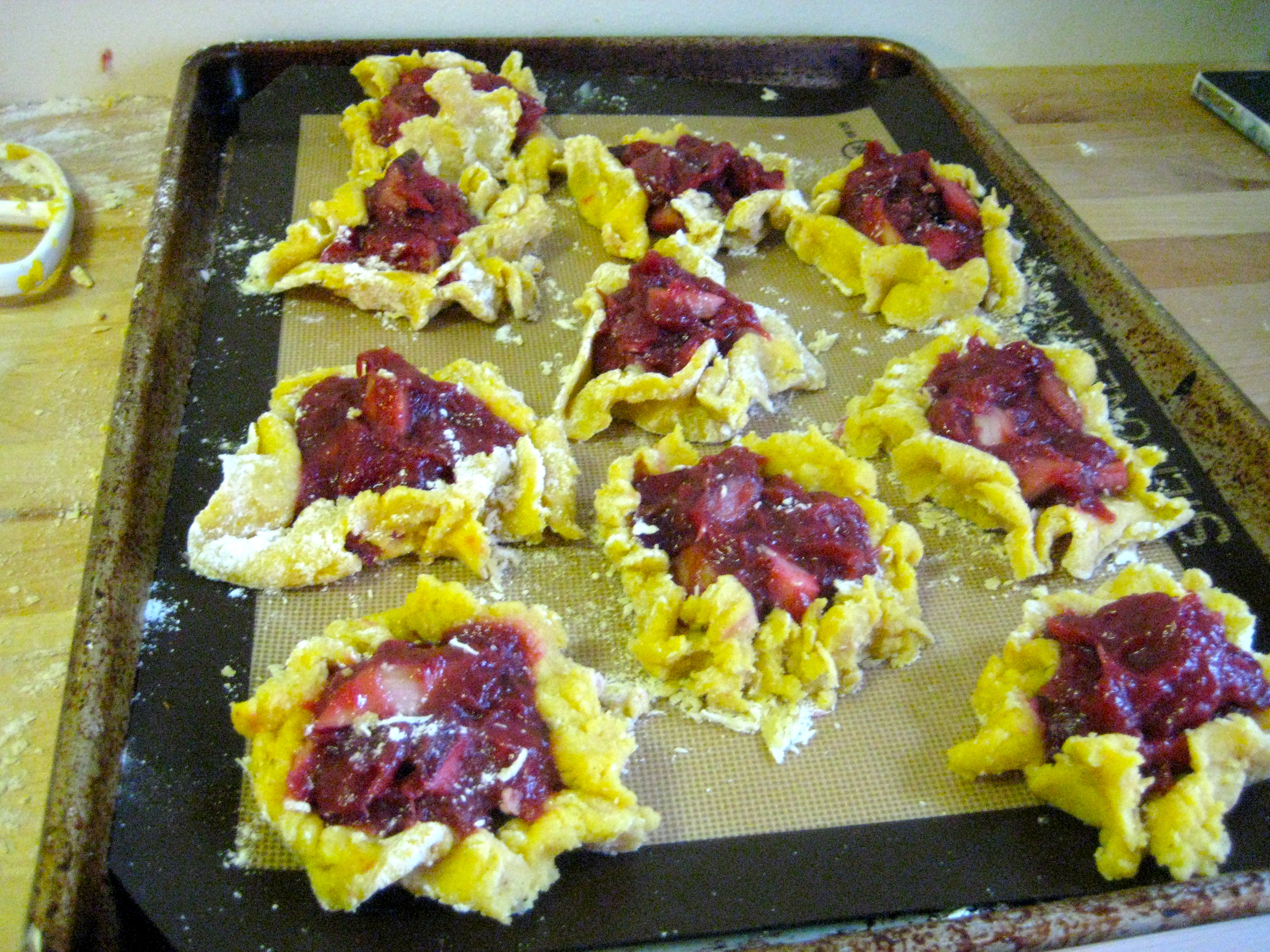 P.S. We enjoyed these cocktails with the delightful company of Martha, who was in town at the time. Her visit was the perfect opportunity to finally make a rhubarb recipe I’ve been itching to make for a while now: rustic corn tarts with rhubarb compote! It is now listed under the appropriate category with notes in Rhubarb Roundup Part 1, but I’ll just stick the pics here: